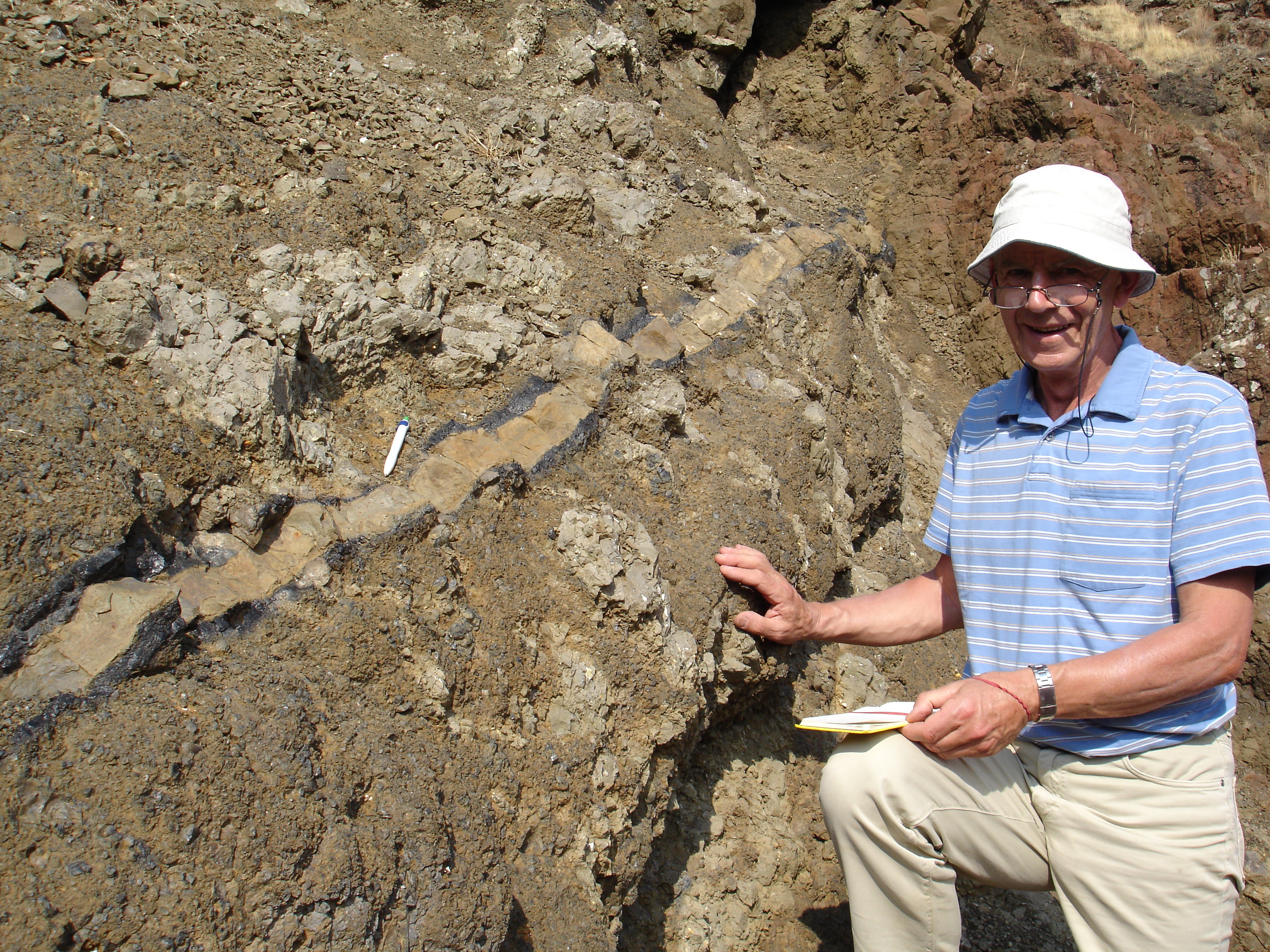 Basalt intrusion into pillow lavas, showing baked margins