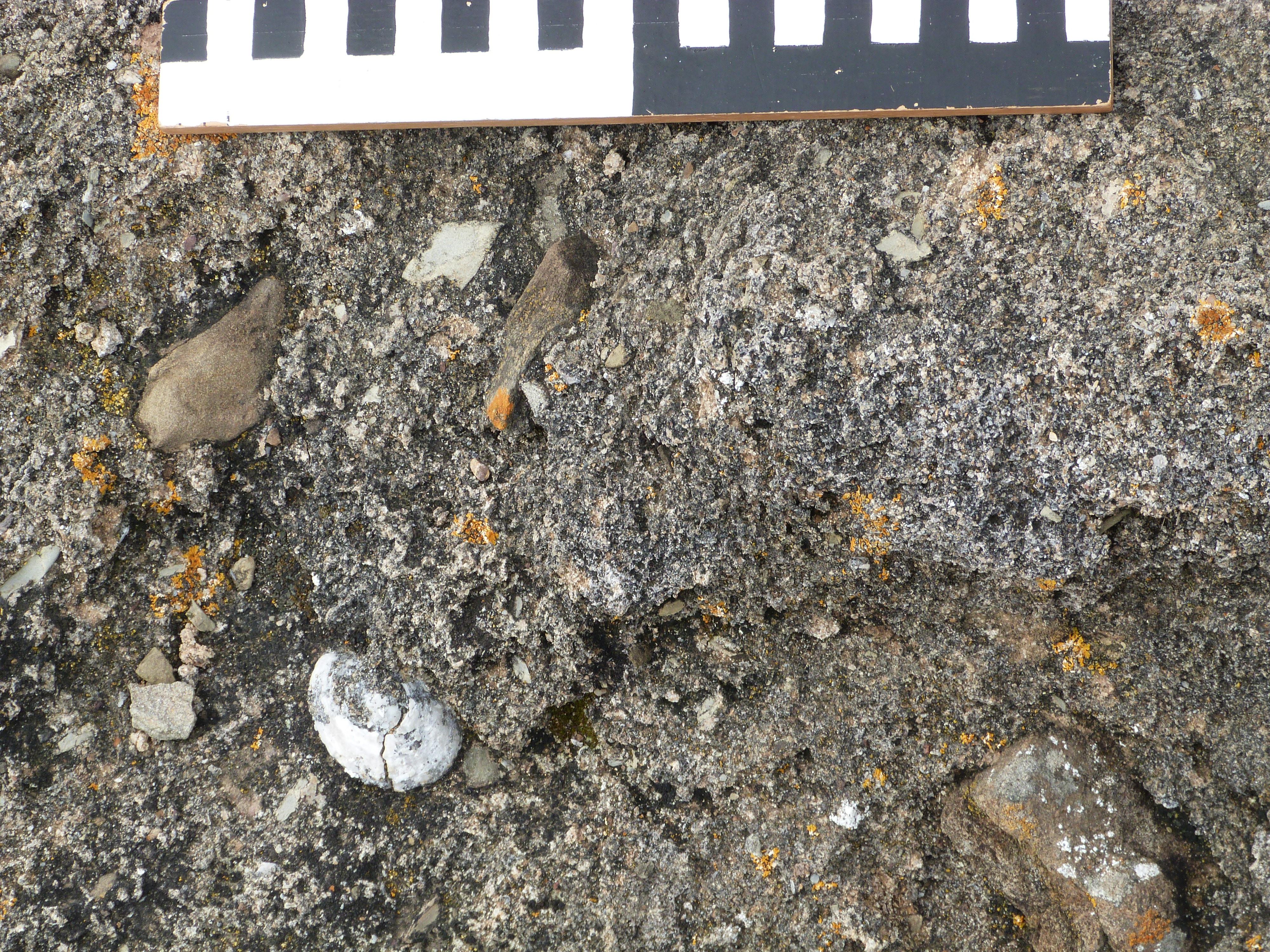 Clasts of bedrock and Patella sp., lithified head deposit