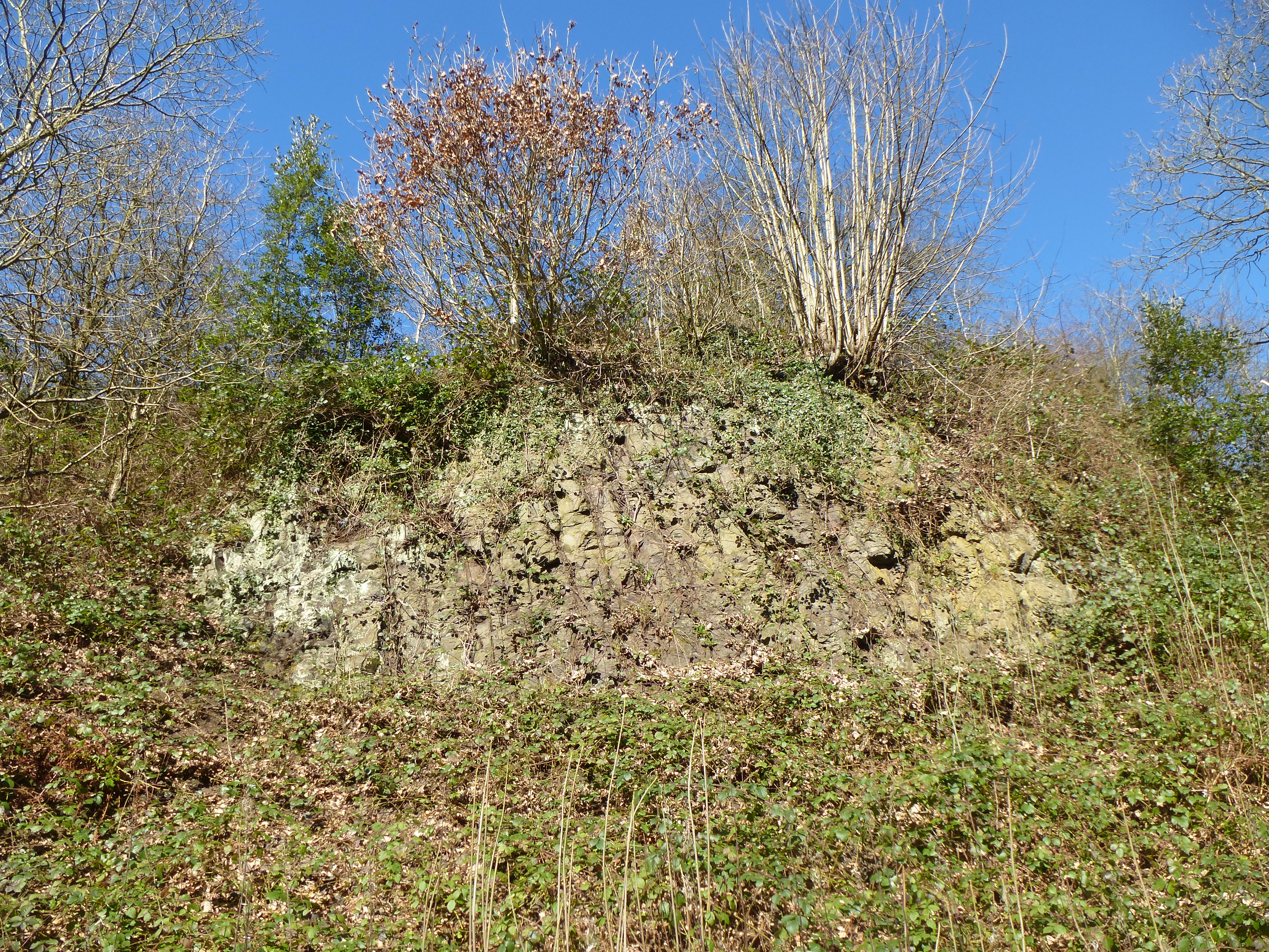 East Quarry - Local siliceous clay (Etruria Marl) metamophosed by the dolerite intrusion - reddish-brown colouration. Olivine dolerite beneath. SW side of disused quarry; section about 5' high